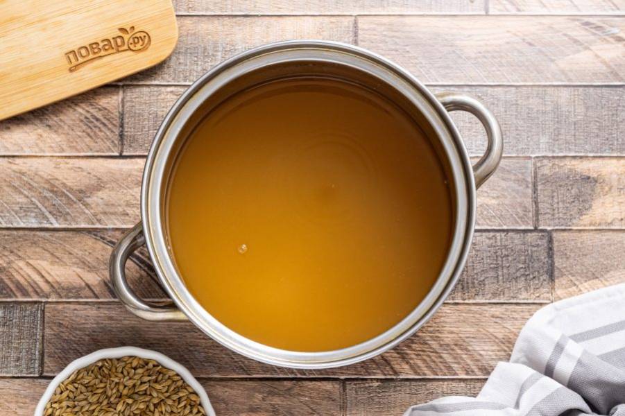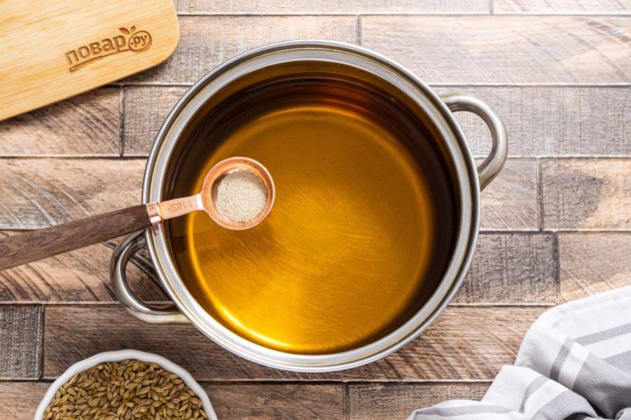 В кастрюле вскипятите воду. Добавьте ячмень. Перемешайте, накройте крышкой. Дайте остыть до такой температуры, в которой можно растворить дрожжи.