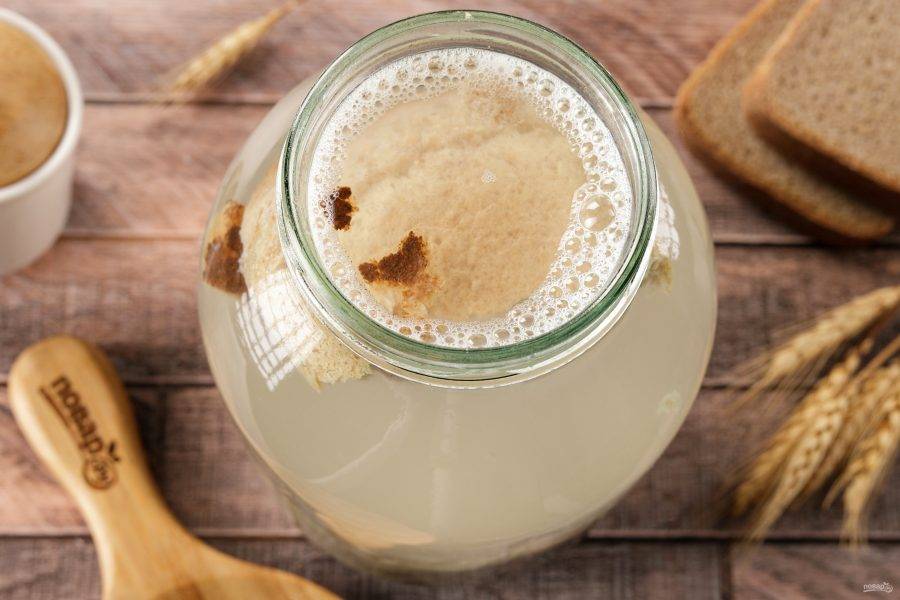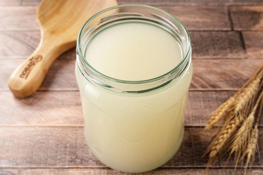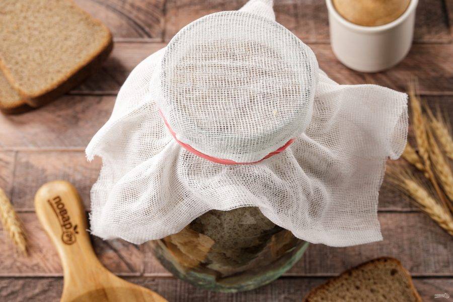 Налейте тёплую воду, чтобы она доходила до плечиков и накройте марлей, фарфоровым блюдечком или стеклянной крышкой, только не полиэтиленовой — дышать не будет и затухнет. Оставьте для брожения в тёплом месте. Скорость будет зависеть от температуры воздуха. У меня банка стояла на окне, чтобы солнышко грело, от сквозняков убираем.
