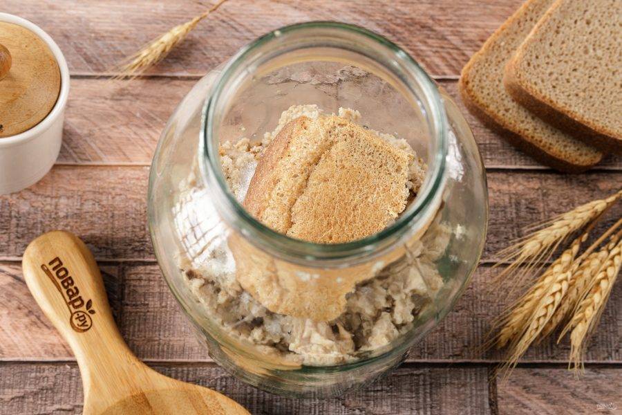 Переложите гущу в банку, наполняя её на 5-7 см. (совсем до конца её не отжимайте, чтобы осталось немного жидкости). Добавьте сахар и кусок хлеба.