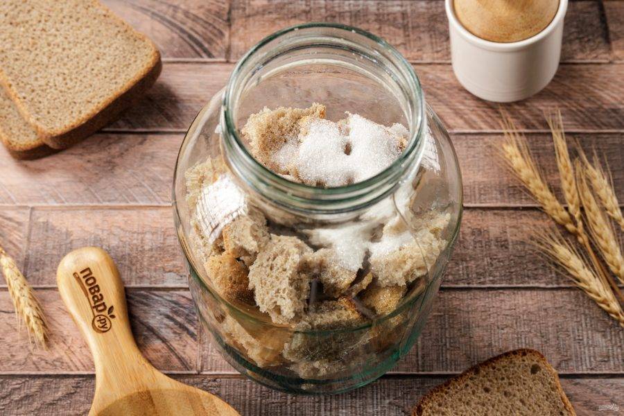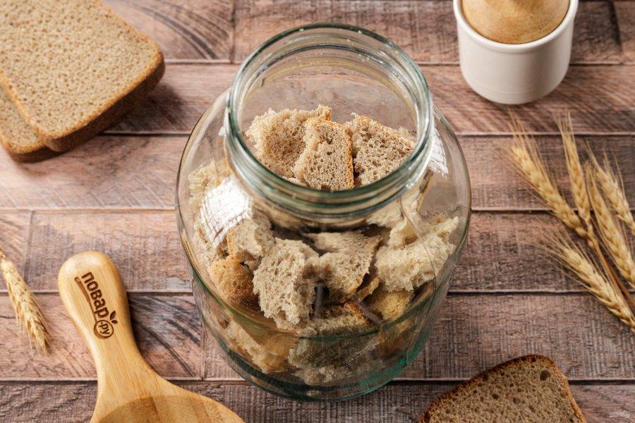 Наполните хлебом банку, где будет квас, чтобы дно банки было заполнено на 5-7 см.