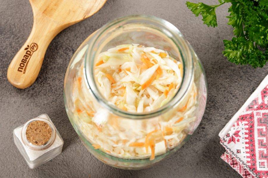 Переложите в двухлитровую банку. Капусту укладывайте как можно плотнее.