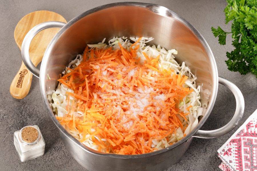 Овощи перемешайте, а затем помните немного руками, чтобы капуста пустила сок.