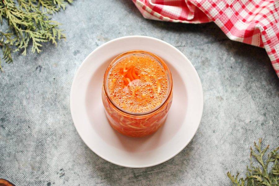 Разложите овощи в чистые сухие банки до плечиков. Залейте банки кипяченой водой температурой 40 градусов. Дайте жидкости впитаться, долейте и при помощи чистого ножа удалите пузырьки воздуха, между слоями овощей. Оставьте банки при комнатной температуре на 5-7 дней, прикрыв крышками и каждый день удаляйте газы, которые будут образовываться во время квашения. После окончания брожения закройте плотно банки крышками и уберите на хранение в холодильник.
