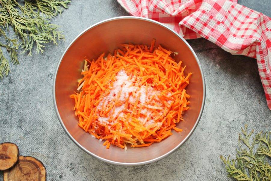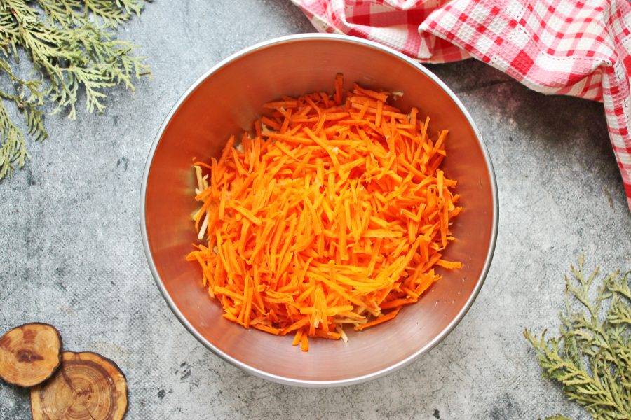 Репу натрите на терке для корейской моркови и выложите в миску.
