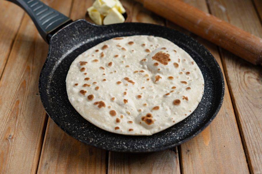 Сухую сковороду разогрейте на среднем огне и выложите на разогретую поверхность раскатанную лепешку.