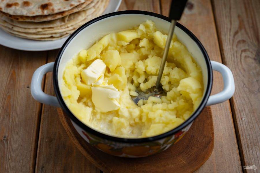 С готового отварного картофеля слейте воду, добавьте соль, кусочек сливочного масла, залейте молоко и истолките толкушкой.