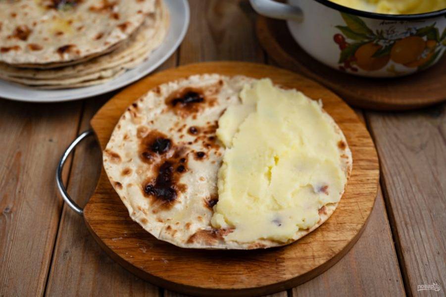Теперь выложите на рабочую поверхность одну лепешку, на половину лепешки выложите 2 столовые ложки пюре и распределите его ложкой слоем по этой половине лепешки.