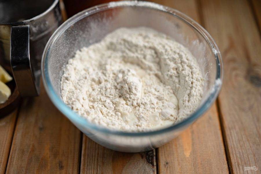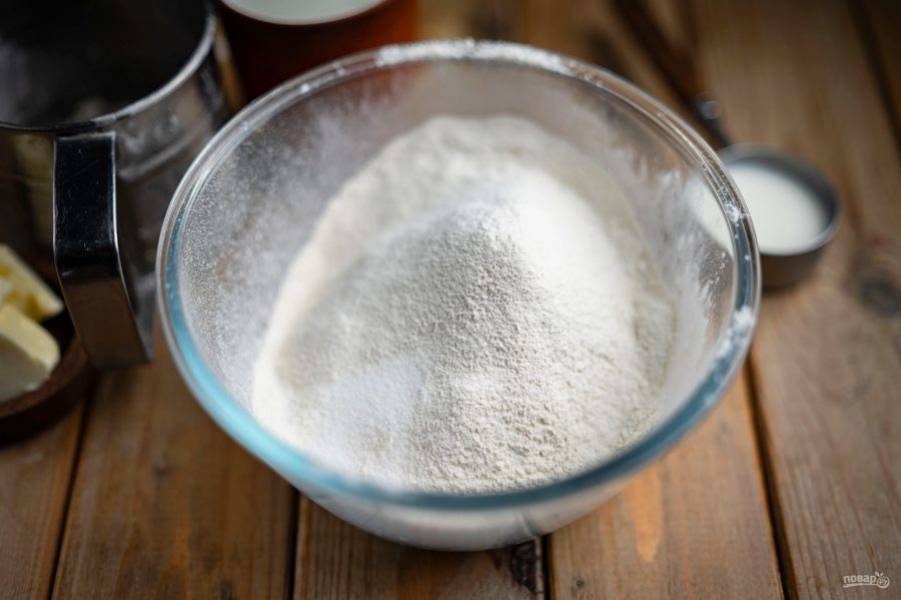 Пока варится картофель приготовьте тесто. В просторную миску просейте муку, добавьте соль. Перемешайте.