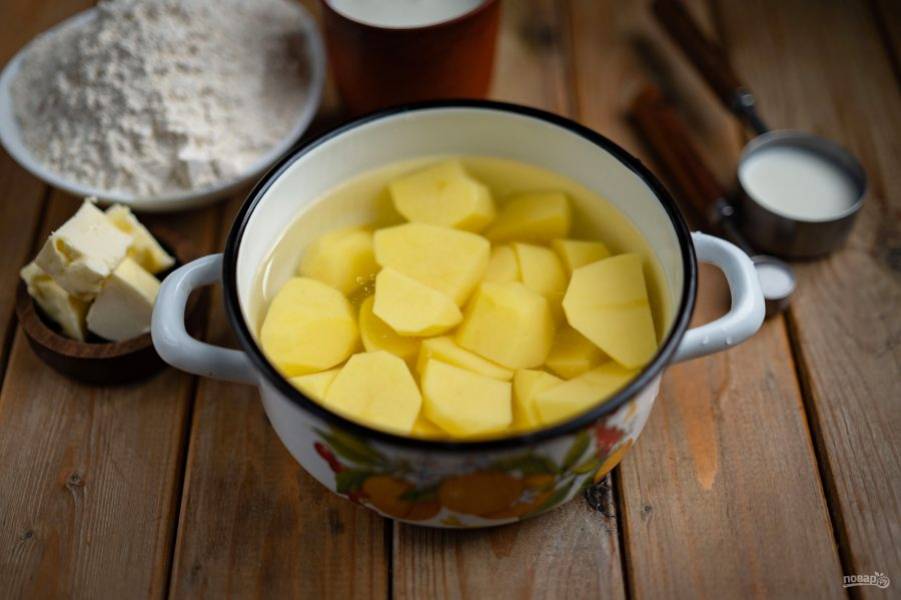 Картофель почистите, помойте, порежьте для удобства на более мелкие кусочки, выложите в кастрюлю с водой, поставьте вариться до готовности.
