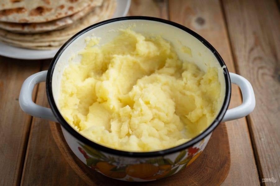 Накройте половину лепешки с картофельным пюре свободной частью и так поступите со всеми лепешками и пюре.