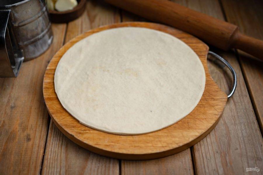 Все тесто поделите примерно на 8-10 небольших частей. Возьмите одну такую часть теста и раскатайте ее скалкой на рабочей поверхности в форме тонкой лепешки, можно с помощью тарелки подравнять края. Диаметр моей лепешки 20 см.
