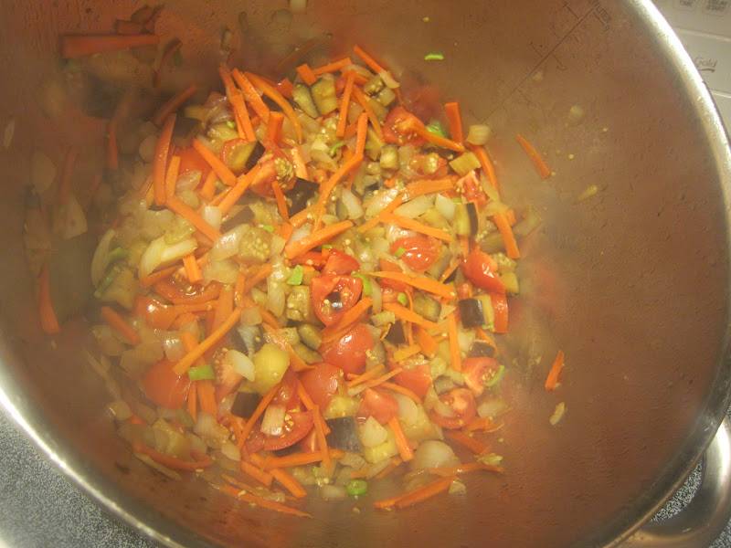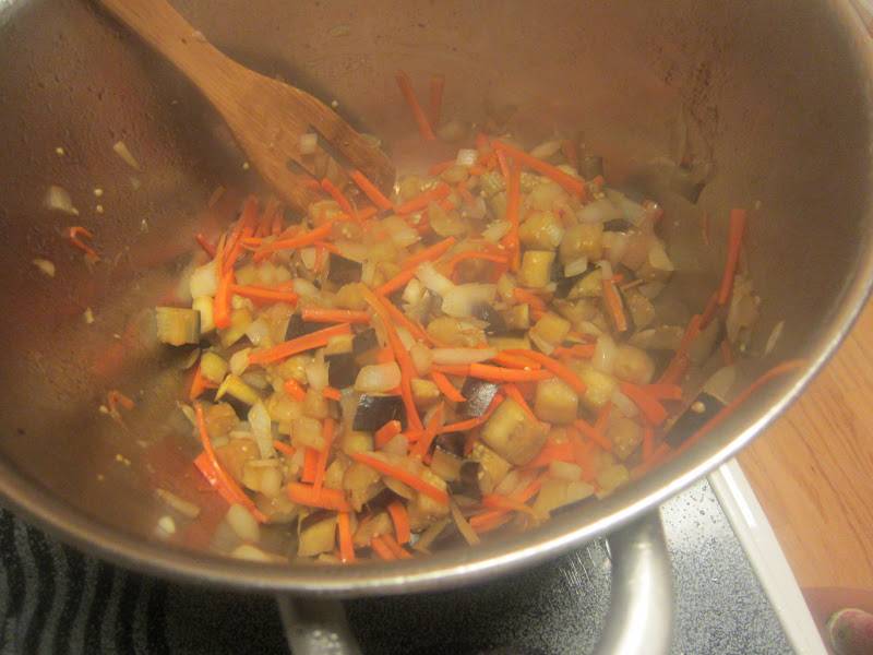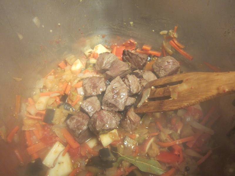 2. Луковицы, морковь и баклажан очистить и нарезать. Отправить в горячее масло, в котором обжаривалось мясо. Периодически помешивая, жарить около 5-7 минут на среднем огне.