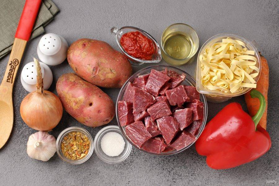 Лагман с картофелем, болгарским перцем и томатной пастой