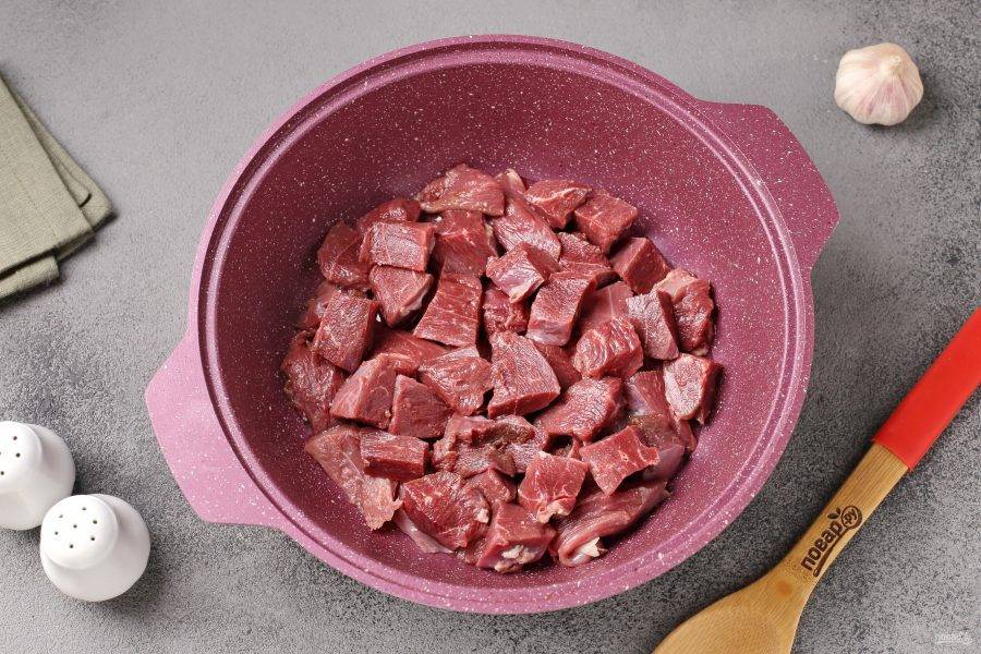 Подготовьте все ингредиенты. Мясо промойте, обсушите и нарежьте небольшими кусочками.