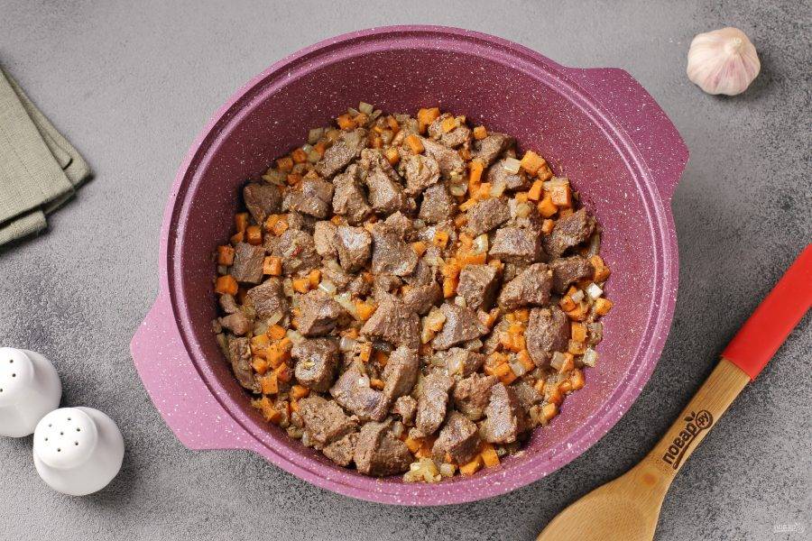 Добавьте нарезанные кубиками лук и морковь. Посолите и добавьте ароматные специи.