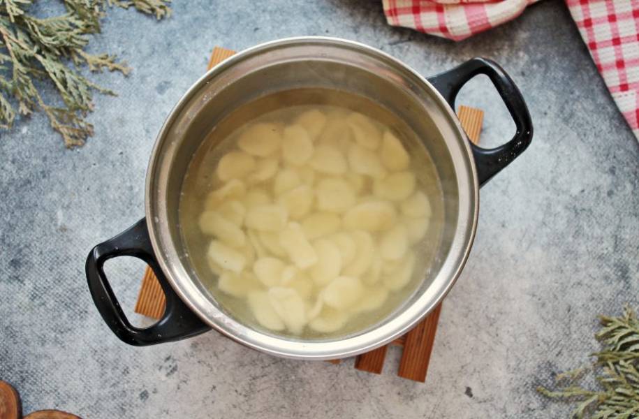 Выложите картофель в кастрюлю, залейте холодной водой, посолите и поставьте на средний огонь. Доведите воду до кипения и варите на среднем огне, пока картофель не сварится. Слейте из кастрюли отвар и закройте картошку крышкой.