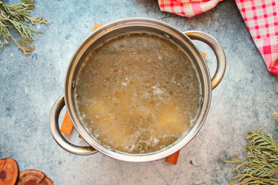 Баранину сполосните, выложите в кастрюлю, влейте холодную воду и поставьте на средний огонь. Доведите все до кипения, посолите и варите, снимая пену, в течение 1-1.5 часов, до мягкости баранины.