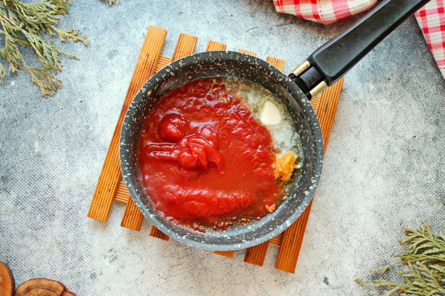 Для соуса помидоры натрите на терке, удаляя кожуру. В сковороду выложите сливочное масло и растопите на среднем огне. Добавьте в сковороду протертые помидоры, посолите и перемешайте. Тушите соус две минуты, добавьте измельченный чеснок, перемешайте и снимите с огня.