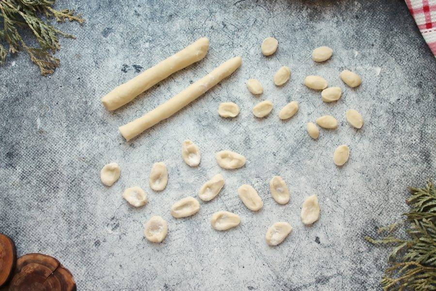 Тесто разделите на куски и скатайте тонкие колбаски. Каждую разрежьте поперек на небольшие части и придавите пальцем середину каждой части.