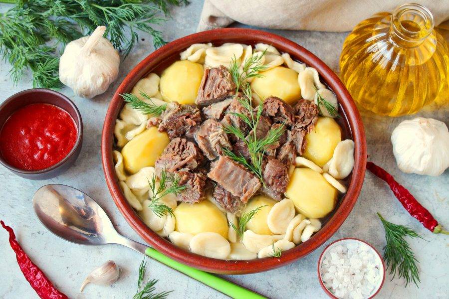 В порционные тарелки выложите отварной картофель, вареную баранину и влейте бульон с лакским хинкалом. Все посыпьте зеленью и сразу подавайте к столу. Приятного аппетита!