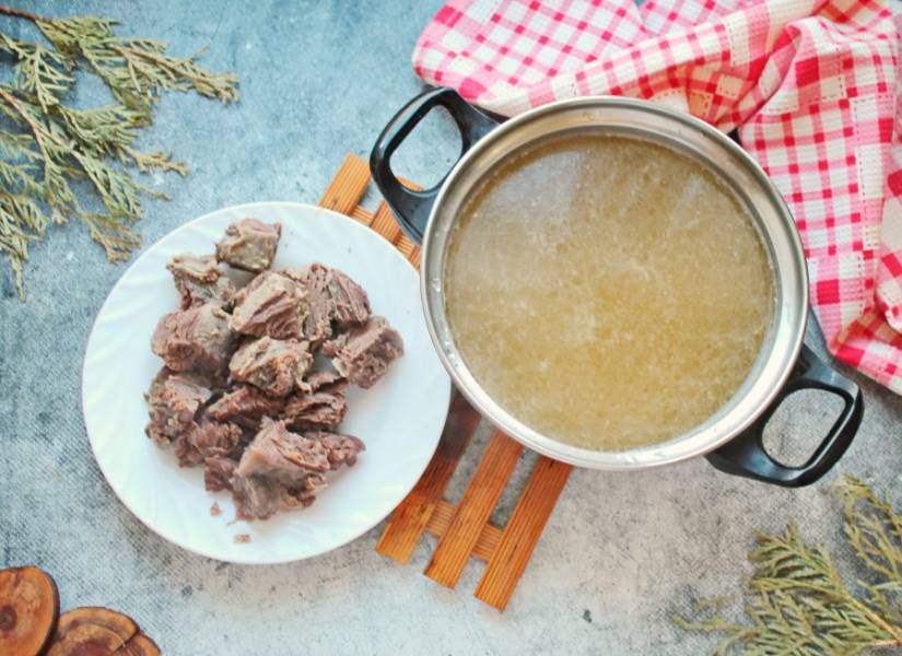 Бульон процедите, баранину нарежьте на куски и закройте, чтобы не остыла.
