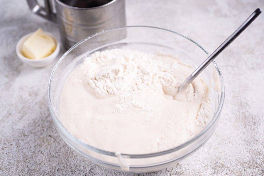 Залейте дрожжевую смесь, которая к этому времени уже подошла (она увеличилась в объеме и приобрела пенообразную структуру).