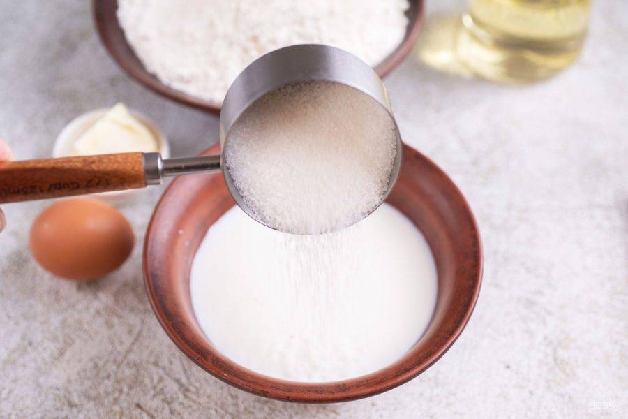 Теплое молоко залейте в отдельную миску, добавьте весь сахар.