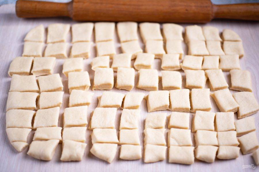 Раскатайте тесто скалкой на рабочей поверхности в пласт толщиной в 0,7-1 см. Нарежьте ножом на квадраты.