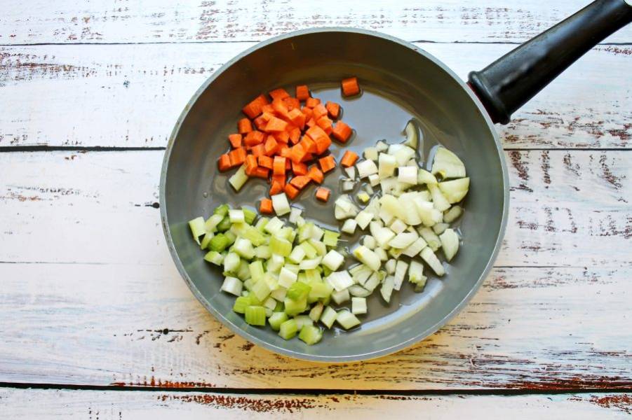В сковороду налейте растительное масло и разогрейте на среднем огне. Репчатый лук, морковь и сельдерей порежьте мелким кубиком и выложите в сковороду. Обжаривайте овощи в течение 7 минут, перемешивая.