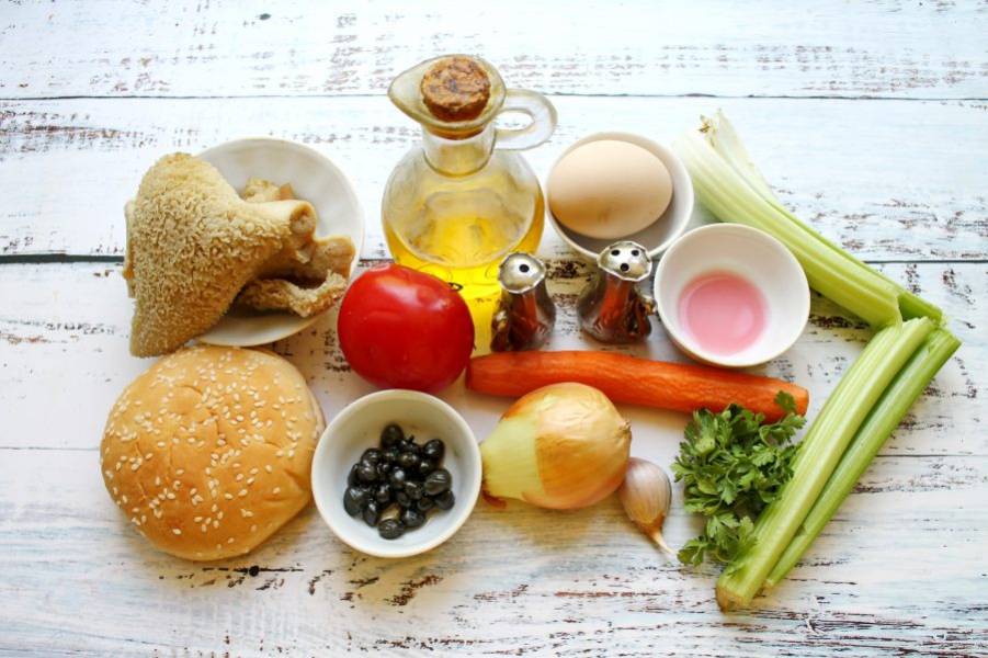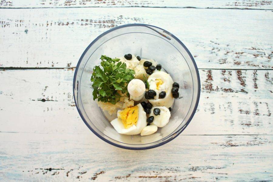Приготовьте соус. Для этого в чашу блендера выложите отварное яйцо, каперсы, чеснок, петрушку, булку и влейте винный уксус и оливковое масло. Пробейте все до однородной массы.
