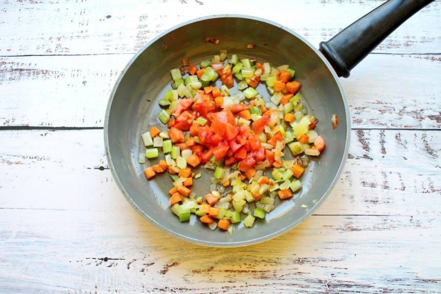 У помидора удалите кожуру, порежьте мелким кубиком и добавьте к обжаренным овощам.