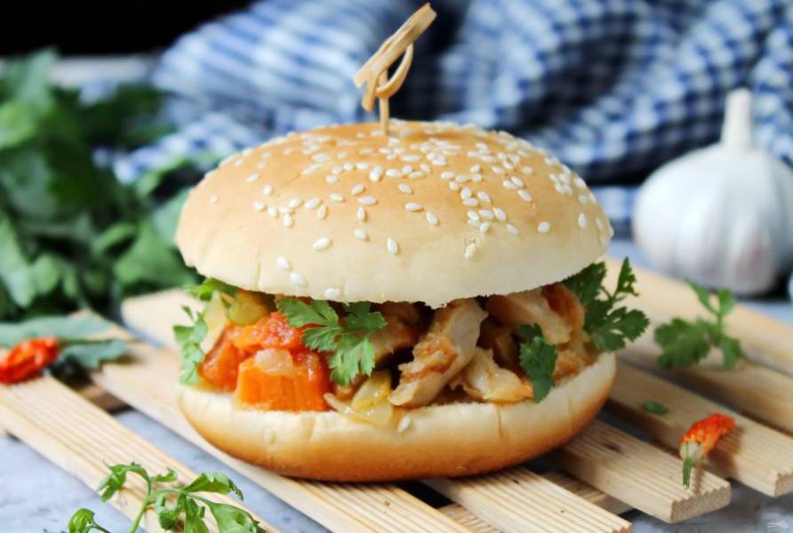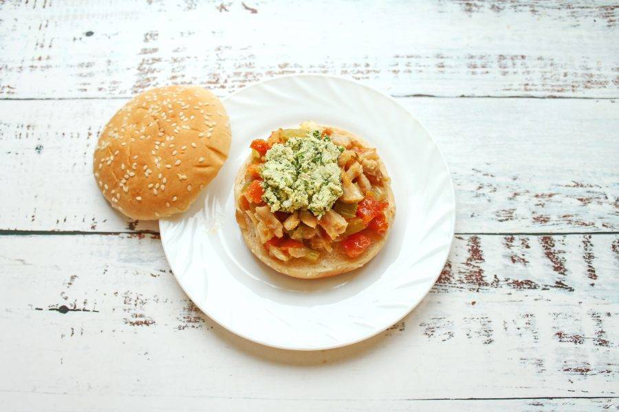 Круглую булочку разрежьте вдоль на две половины. На нижнюю часть выложите тушеный рубец с овощами, затем соус и закройте сверху второй половинкой булочки.