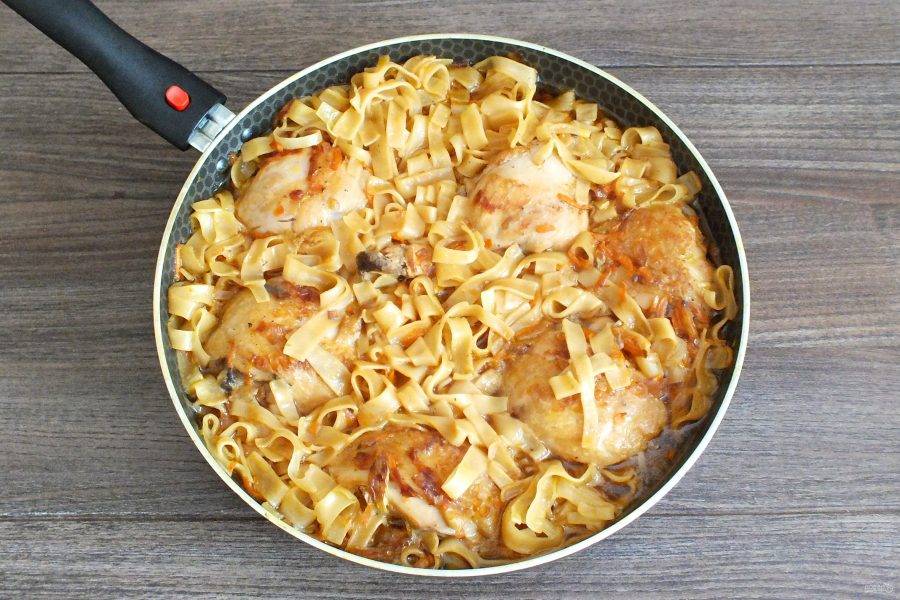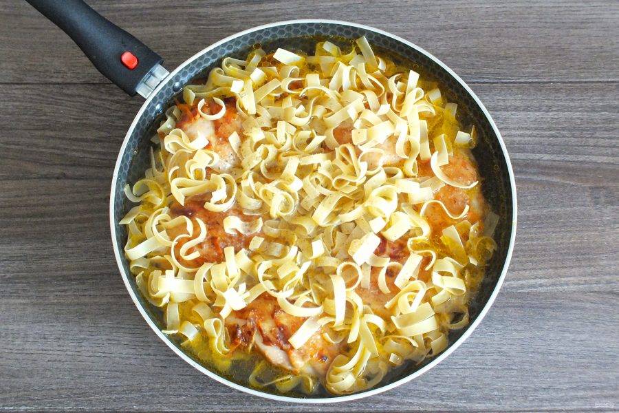 Когда курица будет готова, всыпьте сухую лапшу. Распределите по сковороде равномерно, между кусочками курицы.