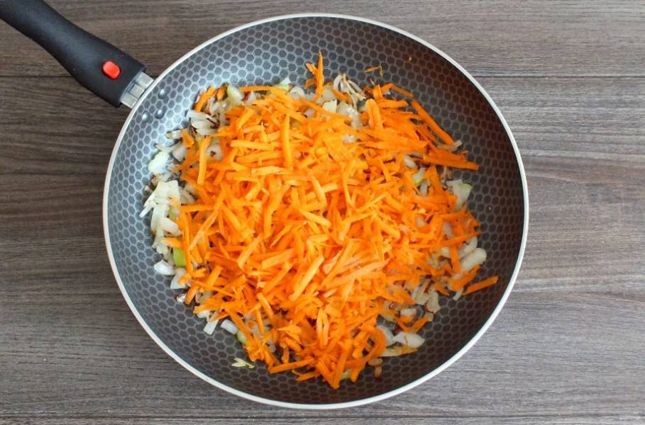 Натрите морковь на средней тёрке, добавьте в сковороду с луком и сельдереем. Обжарьте все вместе в течение 3-4 минут на сильном огне. Не забывайте помешивать.