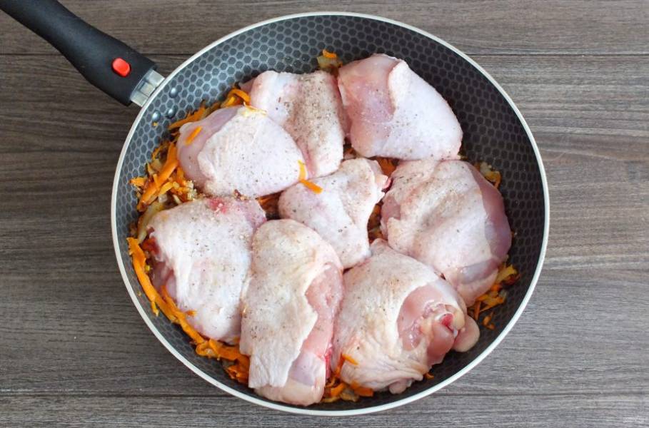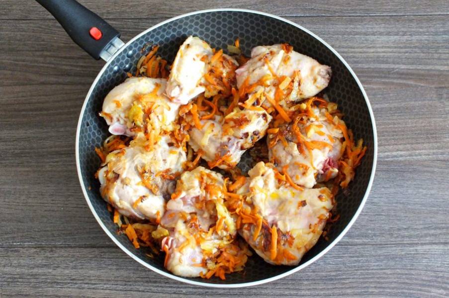 Курицу вымойте, обсушите. Если части курицы крупные, то поделите на 2-3 части. Когда морковь зарумянится, выложите в сковороду курицу.
