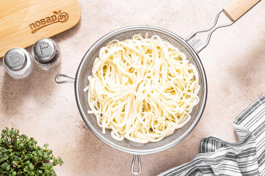 Отделите примерно 120 мл. воды, в которой варилась лапша для соуса. Слейте остальную воду. Лапшу промойте в холодной воде, чтобы она не слипалась. Откиньте на сито и дайте стечь лишней воде.