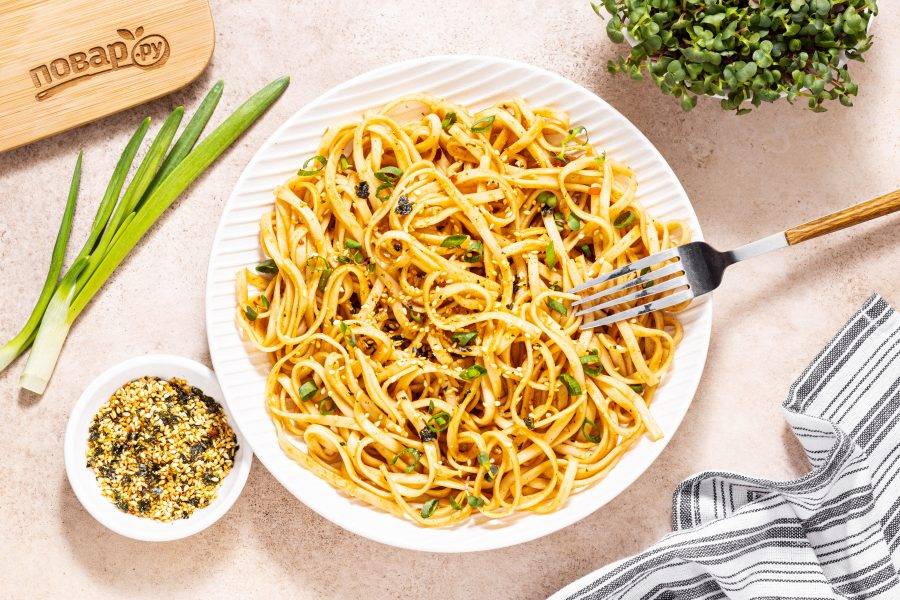 Выложите лапшу в тарелку, посыпьте сверху зеленым луком и жареным кунжутом. Лапша с соусом мисо готова, приятного вам аппетита!