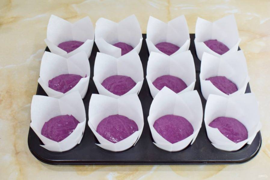 Готовое тесто разлейте по формочкам для капкейков. У меня вышло 12 штук. Поставьте в духовку, предварительно разогретую до 180 градусов, примерно на 25-30 минут. Ориентируйтесь по своей духовке.