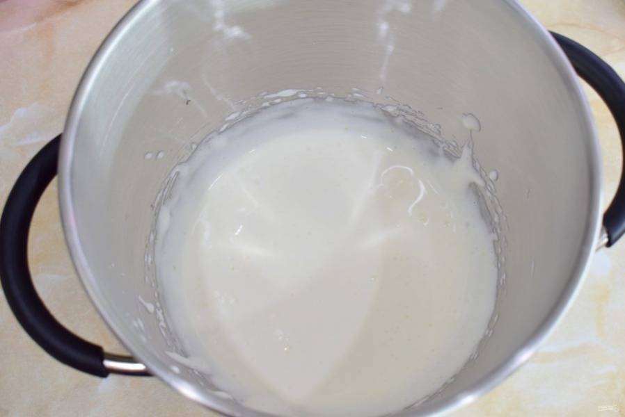 Яйца соедините с сахаром и взбейте в густую пышную массу. Взбитые яйца станут светлые.