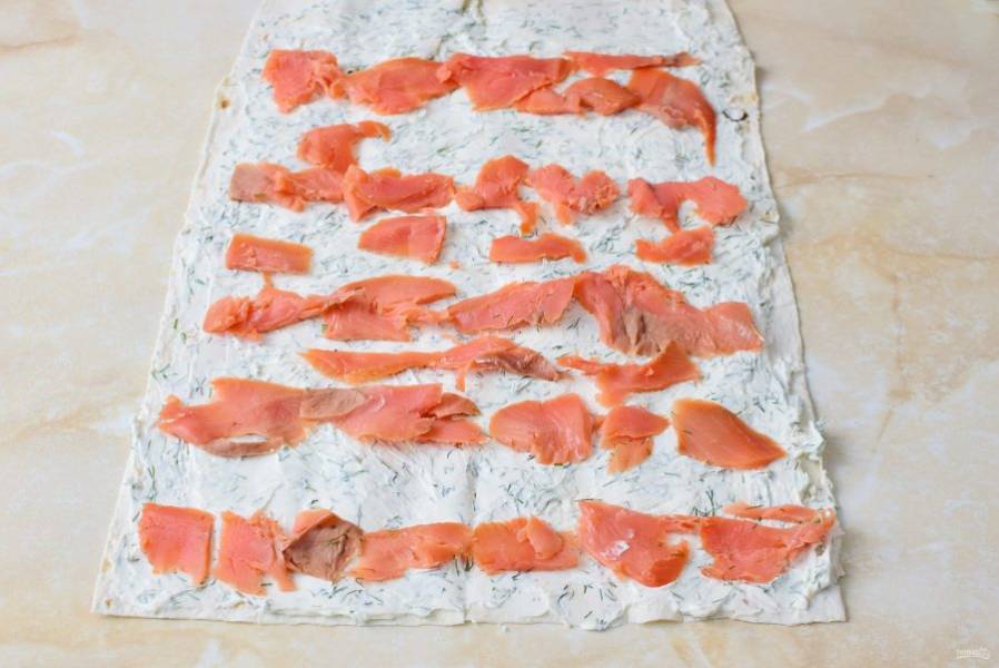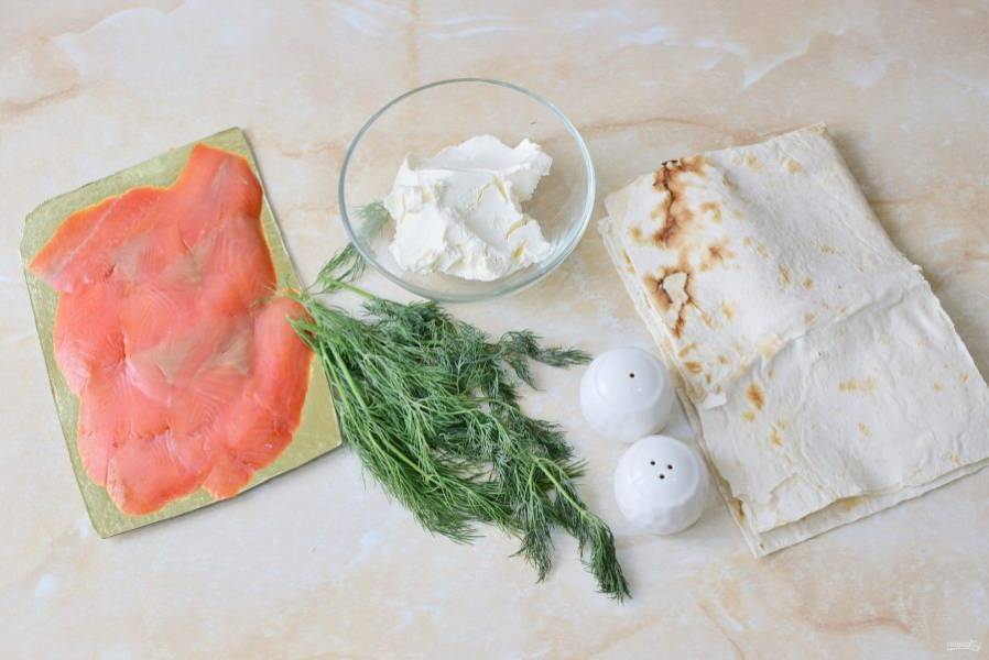Перед началом приготовления подготовьте необходимые ингредиенты. Творожный сыр заранее достаньте из холодильника, чтобы он стал мягкий. Так его будет легче намазать на лаваш.