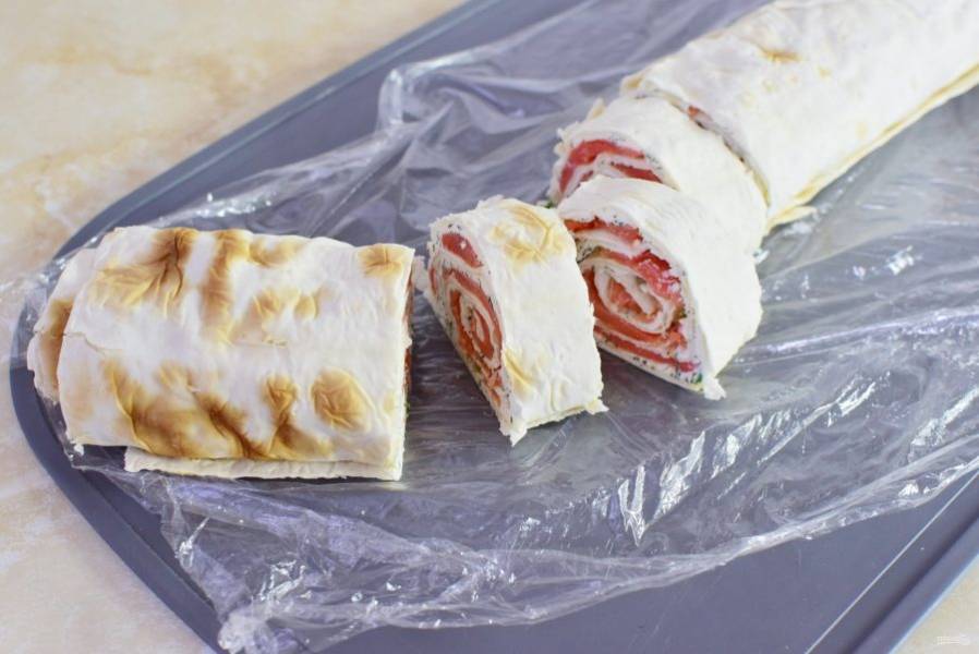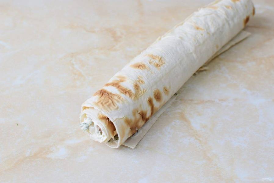 Скрутите лаваш с начинкой в рулет. Оберните пищевой пленкой и уберите в холодильник на 2-3 часа, чтобы он пропитался.