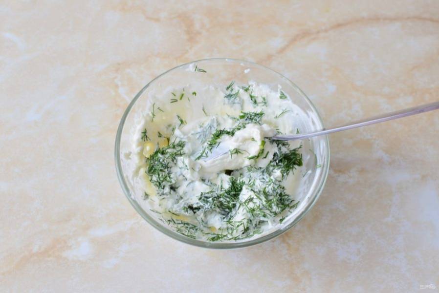 Мягкий творожный сыр смешайте с измельченной зеленью. По вкусу можно добавить соль и специи. Все ингредиенты смешайте.