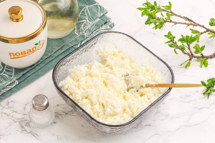 Творог любой жирности тщательно перемешайте с солью и сахаром, действуя с небольшим нажимом. По желанию добавьте немного сметаны или сливок, чтобы масса стала более пластичной. Можно всыпать ванильный сахар или молотую корицу.