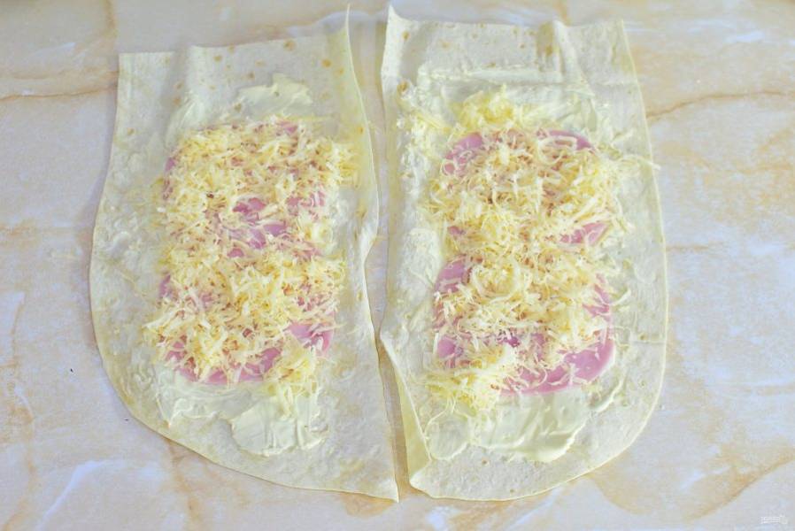 Лаваш нарежьте на кусочки необходимого вам размера. Смажьте лаваш майонезом.