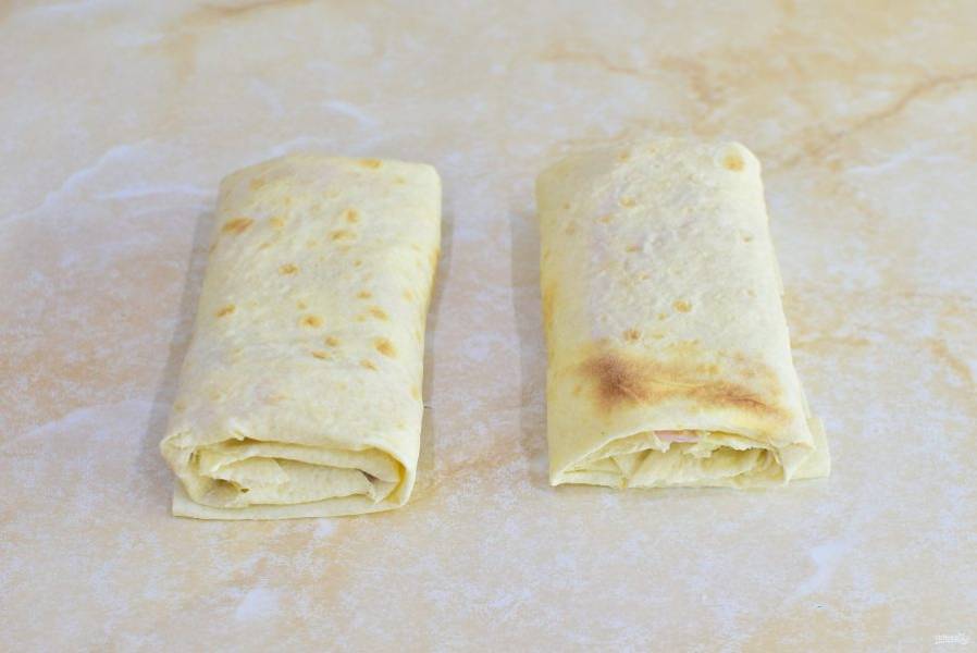 Разогрейте сковороду до горячего состояния и налейте на неё немного растительного масла. Обжарьте лаваш с начинкой с двух сторон на небольшом огне до золотистого цвета.