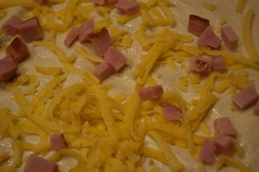 Ветчину мелко нарезать кубиками и выложить поверх слоя сыра.