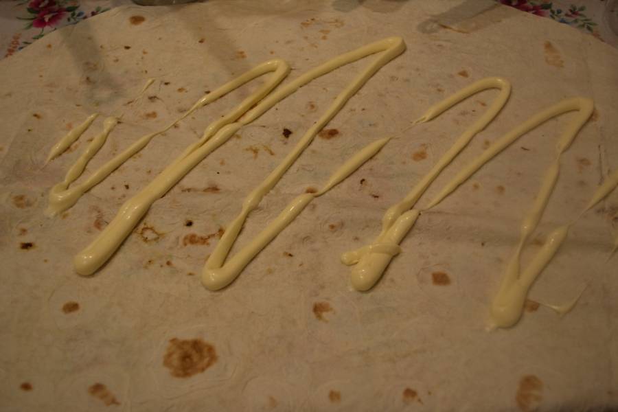 На лист лаваша нанесите тонким слоем майонез. Размажьте лопаткой по всей поверхности.