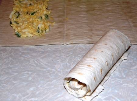Сверните лаваш, смажьте яйцом и запекайте 10 минут при 200 градусах.