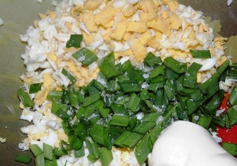 Смешайте зелень и порезанные яйца, соль, майонез.