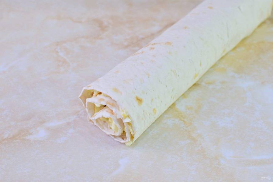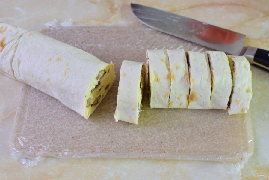 Скрутите лаваш с начинкой в рулет. Оберните его в пищевую пленку и уберите в холодильник на 1-2 часа, чтобы он пропитался.